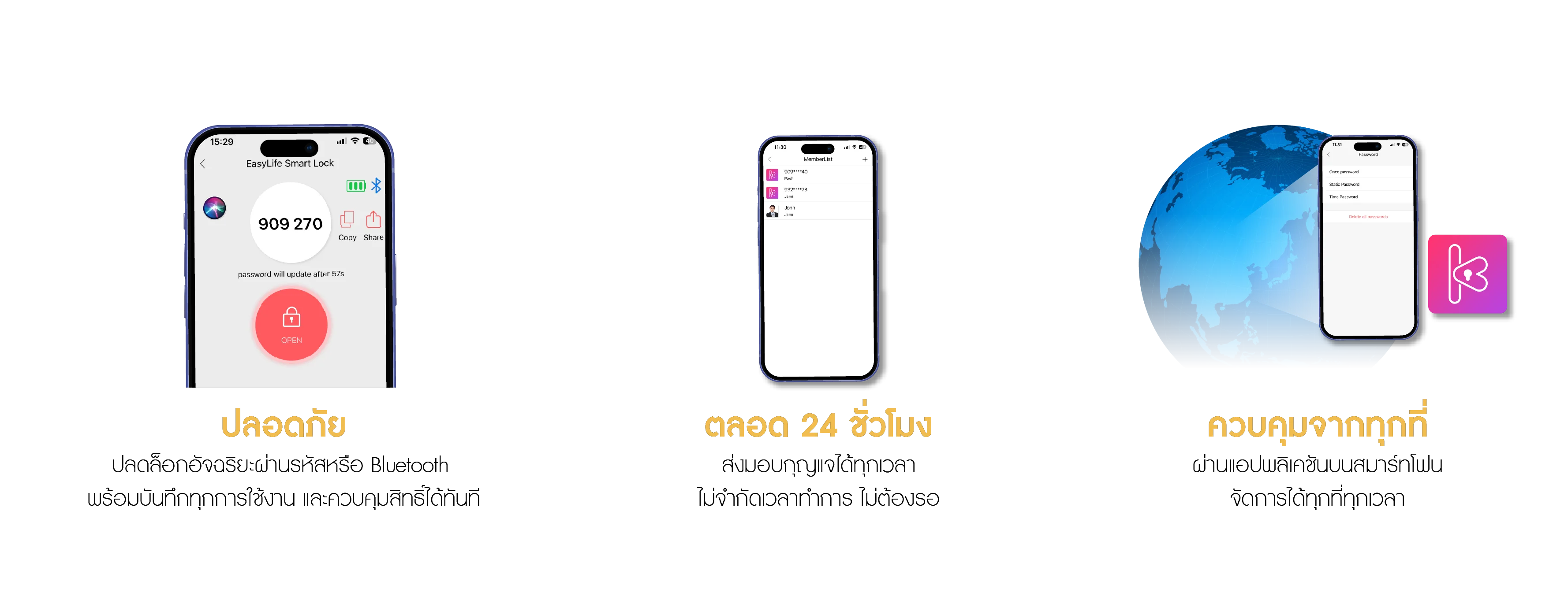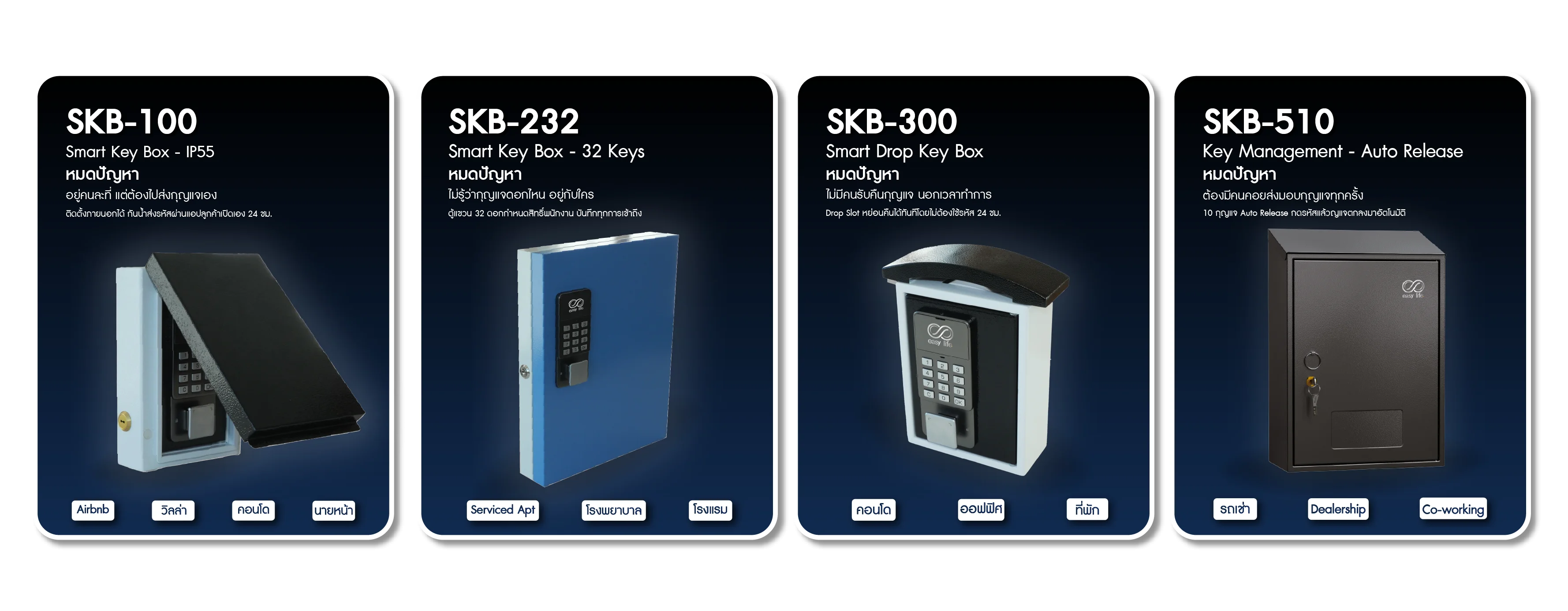 ไม่ว่าจะเป็นโรงแรม ที่พัก อสังหาริมทรัพย์ หรือธุรกิจเช่ารถ เจ้าของธุรกิจสามารถส่งรหัสให้ลูกค้าผ่านแอปพลิเคชัน ลูกค้าเปิดกล่องหยิบกุญแจได้เองตลอด 24 ชั่วโมง